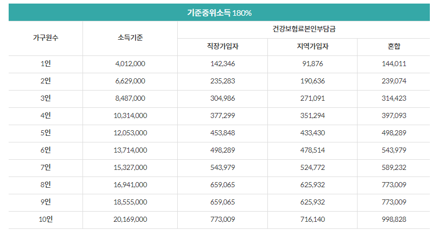 2024년 가구원수・가입유형별 기준중위소득 180% 이하 판정 기준표