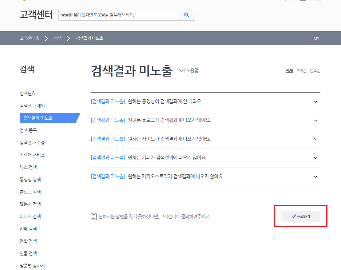 고객센터 클릭 후에는 위와 같은 화면이 나오더군요. 그런데 저 많은 카테고리들 중에 검색결과 미노출이라고 딱 나와있는 것이었습니다. 그래서 바로 클릭했죠
