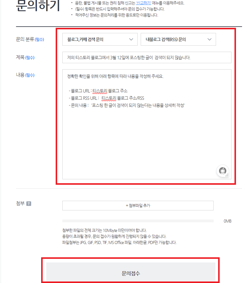 그러고 나서 문의하기 버튼을 누르고 저의 포스팅 누락 문제에 관련해서 문의를 했습니다.
