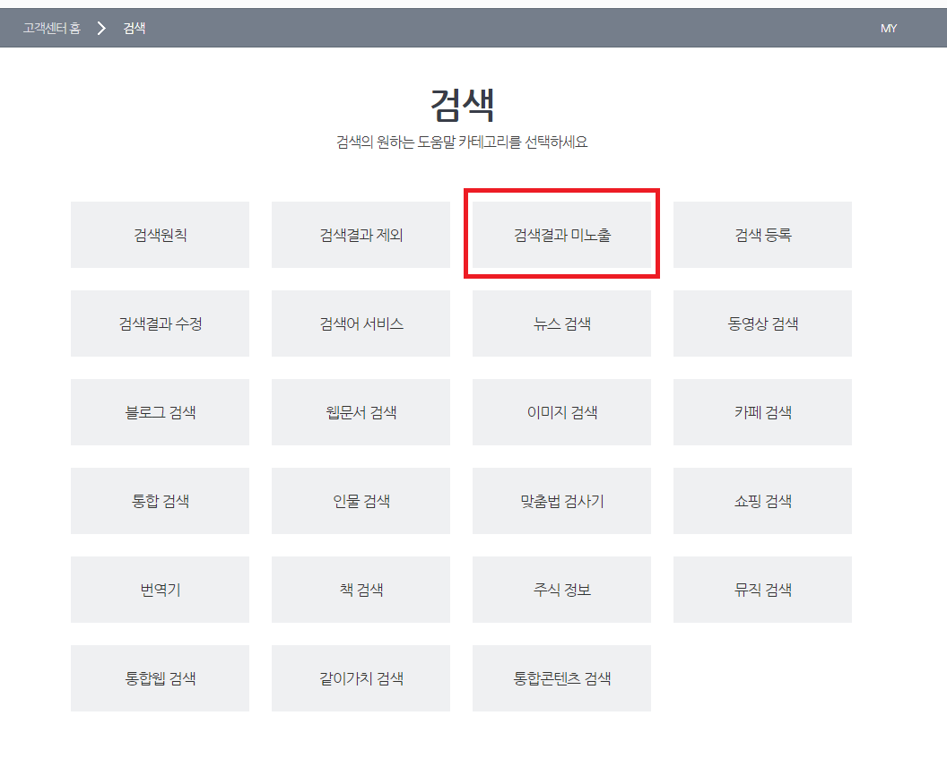고객센터 클릭 후에는 위와 같은 화면이 나오더군요. 그런데 저 많은 카테고리들 중에  검색결과 미노출이라고 딱 나와있는 것이었습니다. 그래서 바로 클릭했죠