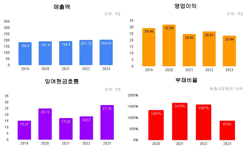 잉여현금흐름은 들쭉날쭉한 모양새를 보여주고 있어 불안정한 느낌이지만 그래도 23년에는 5년 중에서도 가장 많이 확보했다는 점에서는 긍정적이다.