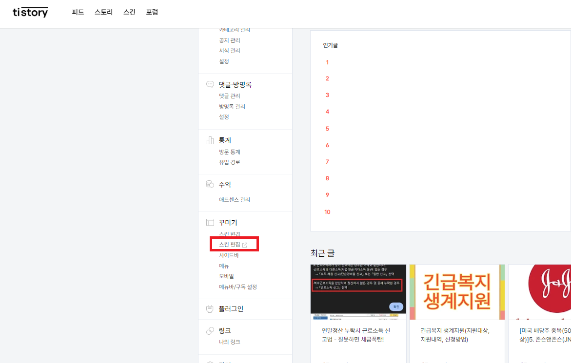 티스토리 메인페이지 사이드바 메뉴에 꾸미기-스킨편집을 누른다.